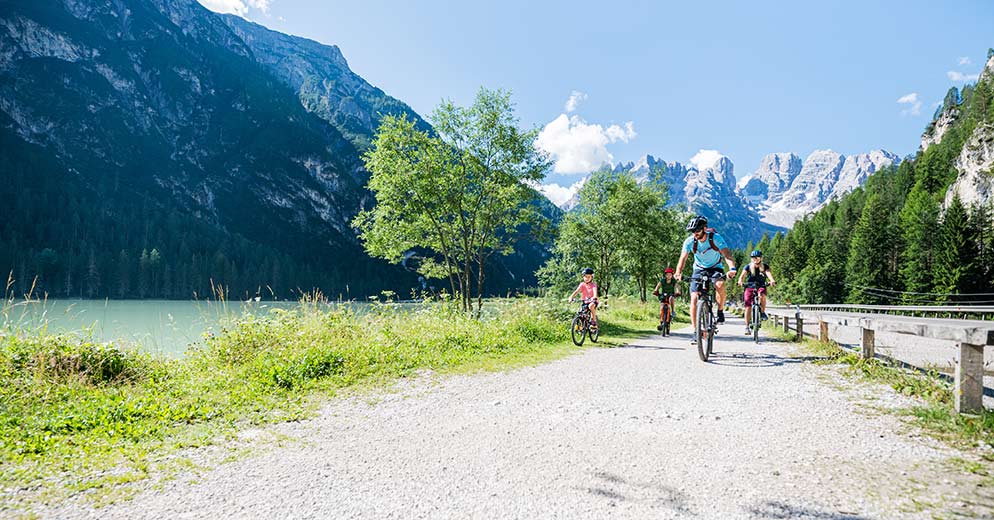 Langlaufzentrum in Toblach, führt der Radweg Toblach Cortina zunächst zum Toblacher See. Die